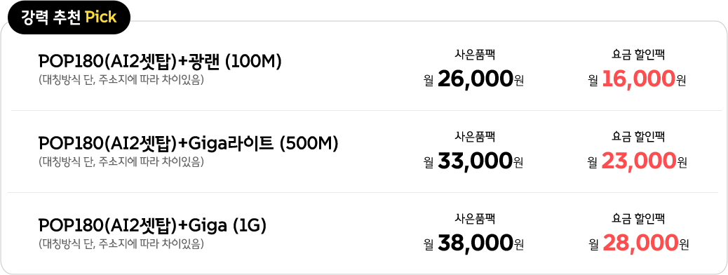 | 광랜 (100M) | POP 180 | 184ch | 26,000원 | 24,000원 | 사은품 최대 AI스피커형 셋탑박스 (유투브, 구글인공지능 NUGU서비스) 스마트3셋탑시 넷플릭스 지원 |